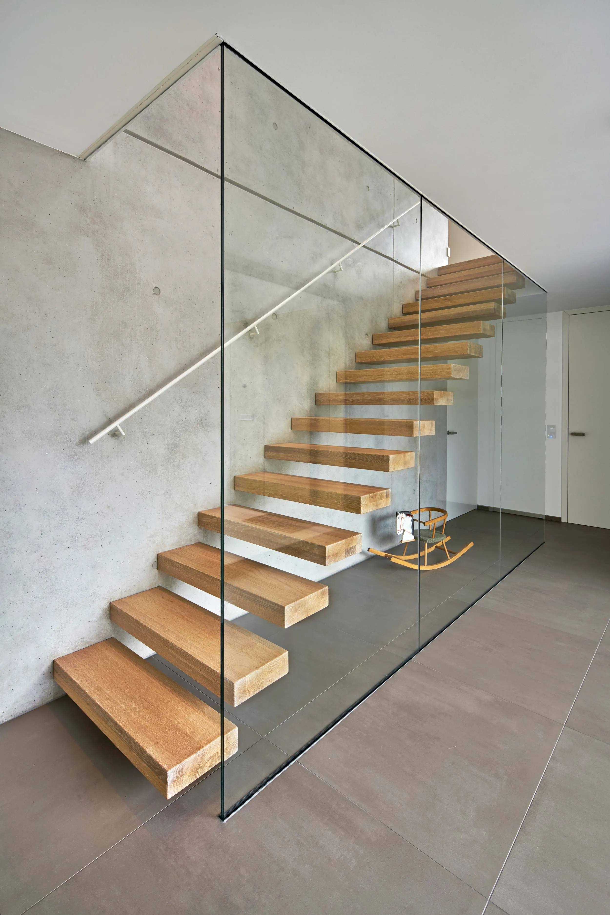 Der Eingangshof ist der Straße zugewandt und bildet einen geschützten Auftakt. Hier zeigt sich der Komplex introvertiert und wird dem Bedürfnis nach Privatheit gerecht. Dennoch ergänzt eine dezent inszenierte Transparenz die Verschlossenheit: Durch das einzige Fenster erkennt man die Kragarmtreppe mit ihrer filigranen und luftigen Optik. Sie ist damit viel mehr als nur der Aufstieg ins nächste Geschoss und wird zum Blickfang.